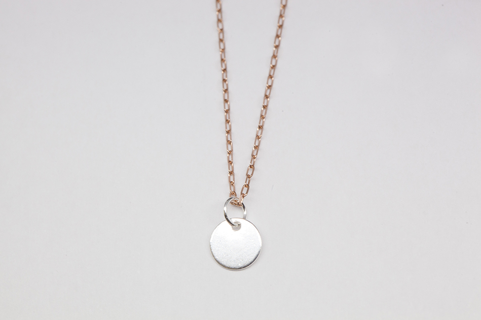 Reinventamos el clásico modelo de chapita colada, versionándolo en su versión más mínima. Realizado en cadena forzada (eslabones) de plata 925 con baño en 1 micra de oro rosa y una chapita de 5mm de diámetro.